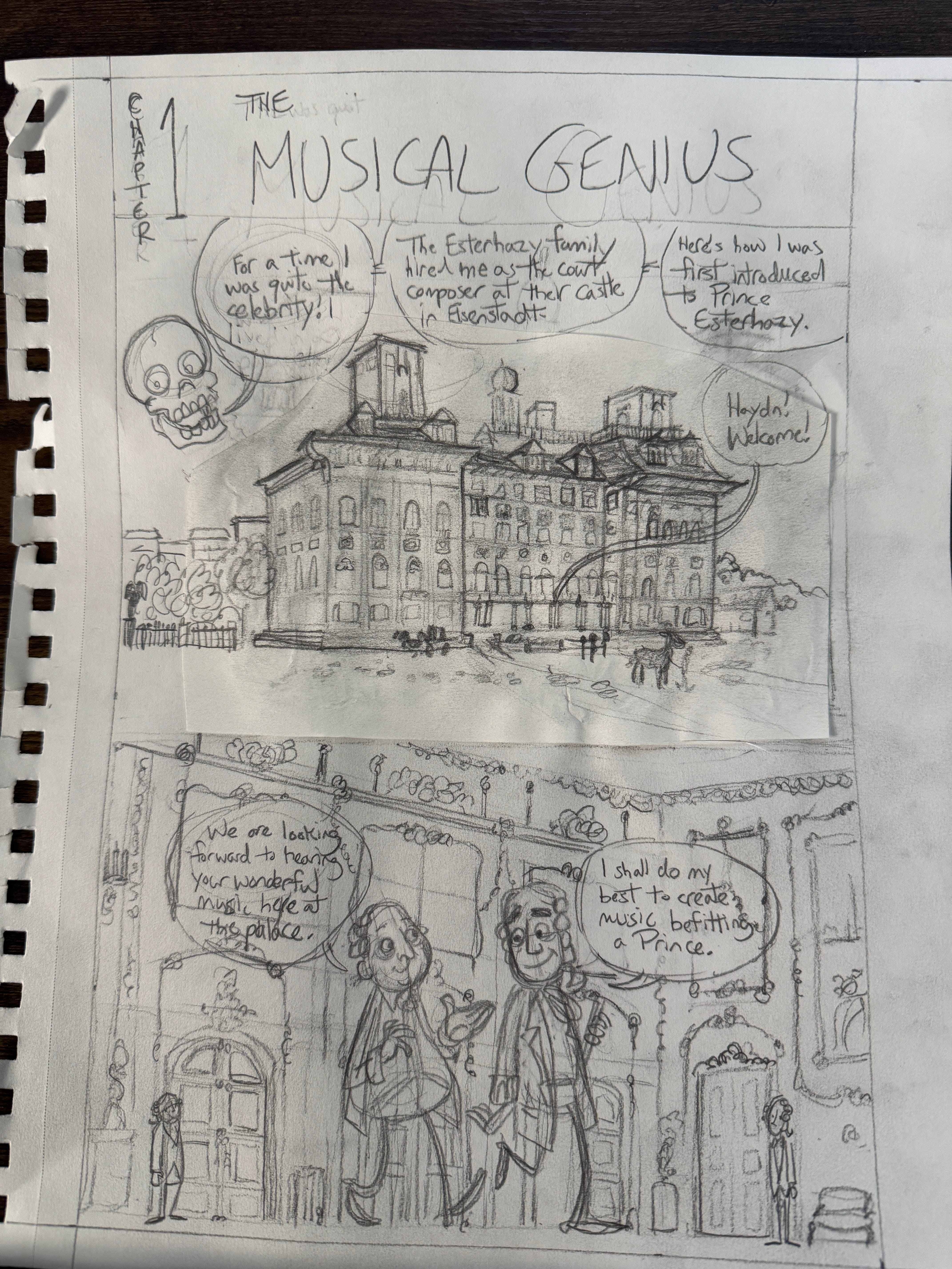 I’m currently working on a new graphic novel, which I’m going to use Kickstarter to crowdfund (more on that in later posts, with an opportunity to be notified when it launches). I’m not quite ready to reveal what it’s all about just yet, but all you need to know is that this is the first page on a new chapter in which composer Joseph Haydn goes to work at Esterhazy Palace as the court composer. The story is narrated by Haydn’s skull, but you’ll have to wait until the campaign to find out why. Trust me—its a doozy of a story.