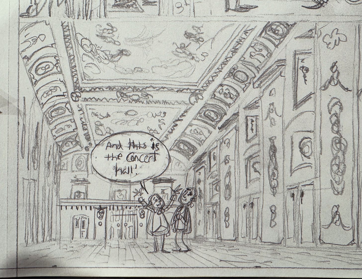 You can also see my thumbnail for the page in the top right corner. I decided that I still wanted to do a spread of the inside of the palace as well so that the reader could see the lavishness of the palace interior. It’s a big place with big rooms, and I wanted to capture that. I had some reference photos for the interior of the palace, including this room which seemed like a good one to use.