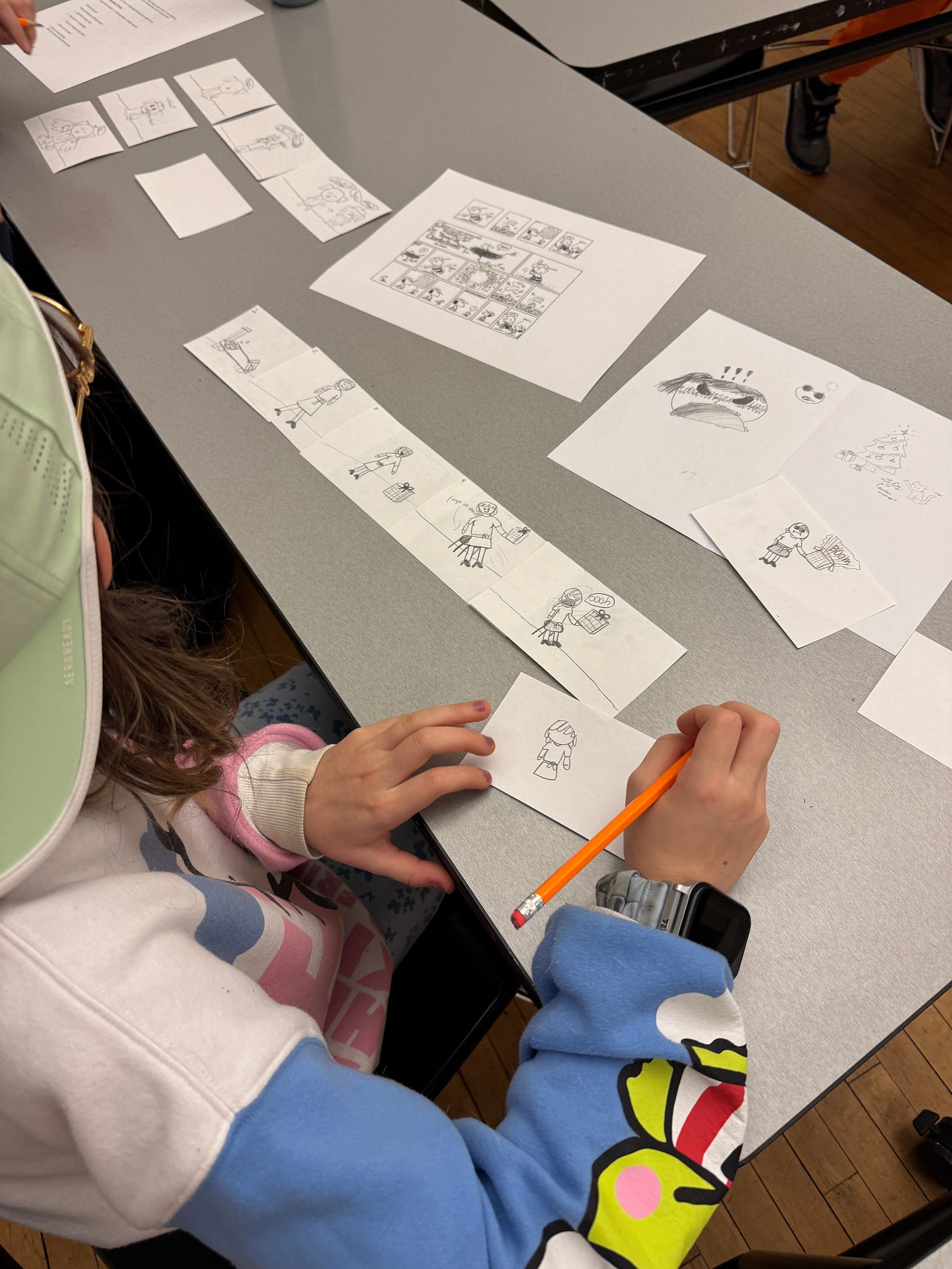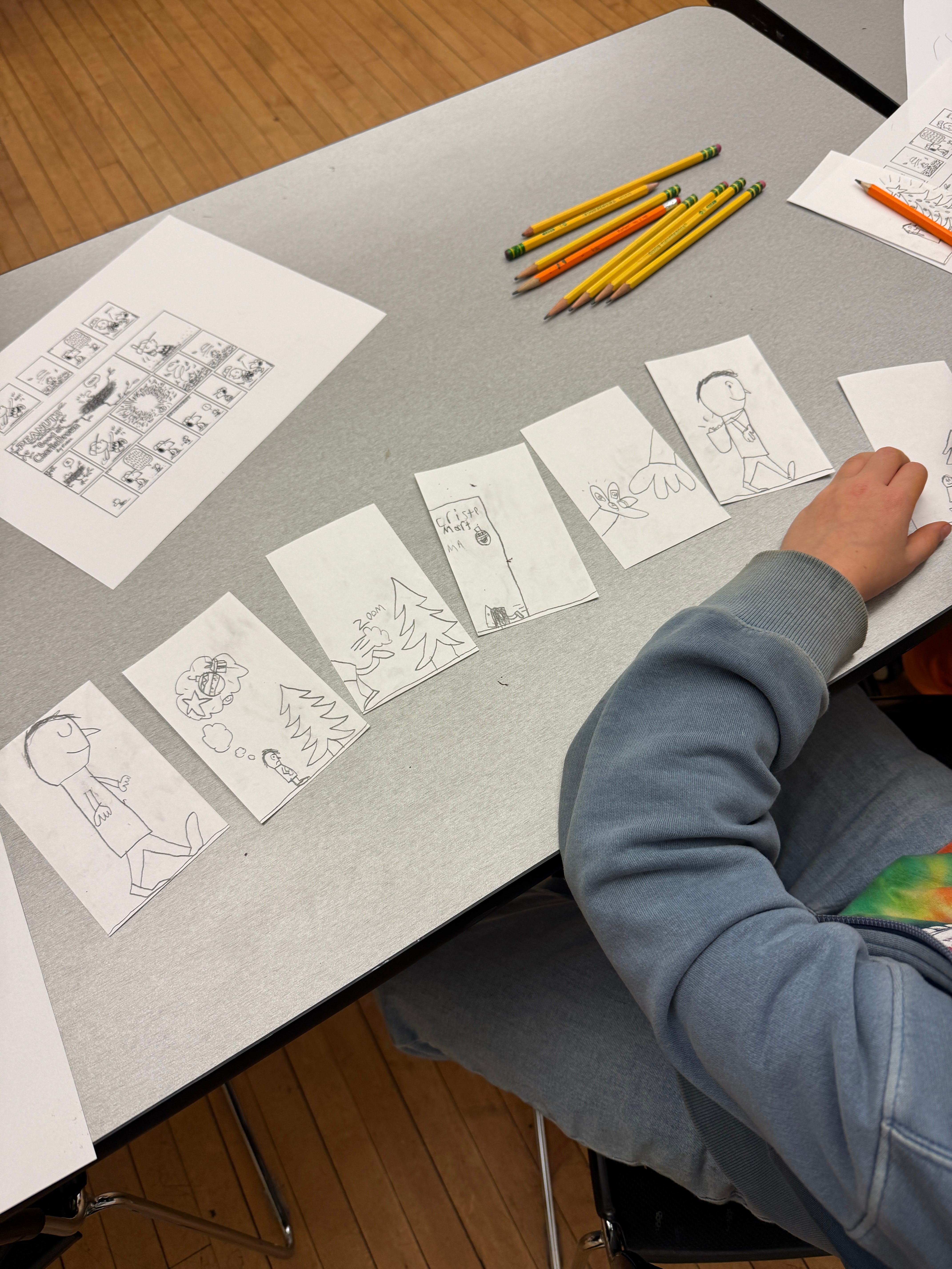 They start by drawing a simple two panel comic on two index cards: a setup on one card and reaction on the other. For example a kid opens a present, then sees what’s inside.