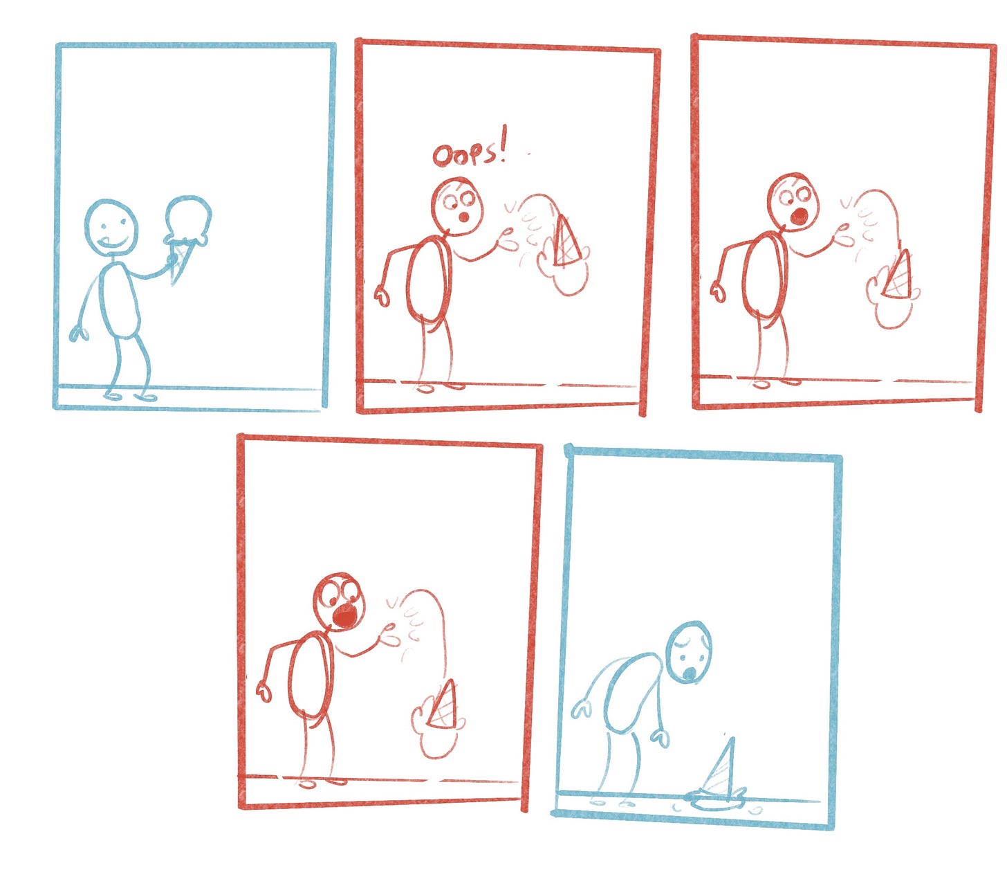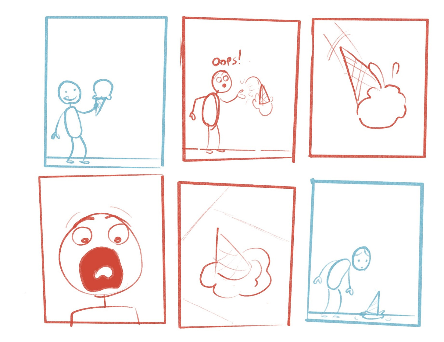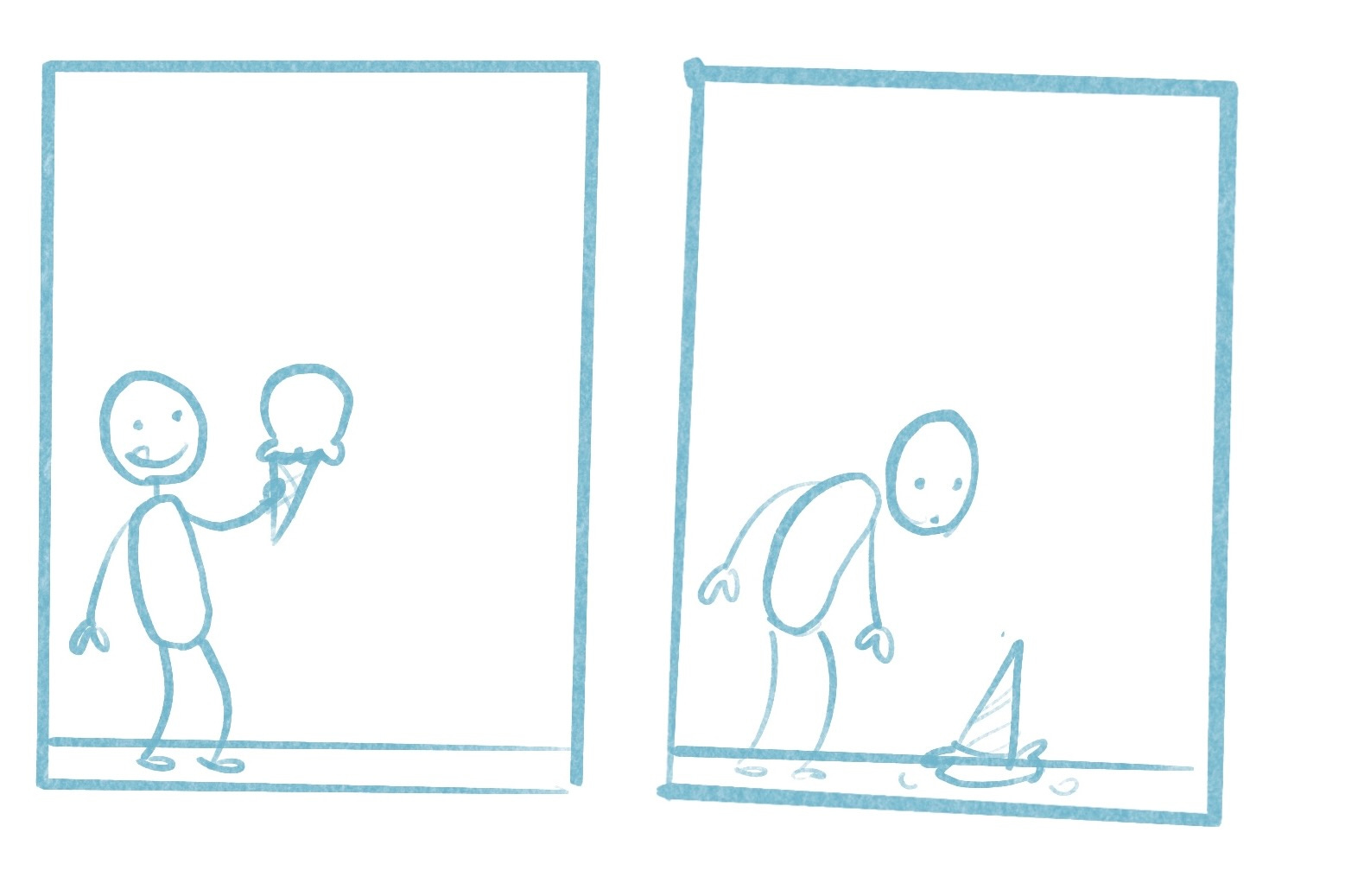 Here’s an example of these methods in action. Here’s a simple two panel comic I drew. Just set up and reaction. We fill in the gaps between the panels and assume that the character —let’s call him Norman—dropped his ice cream cone on accident.