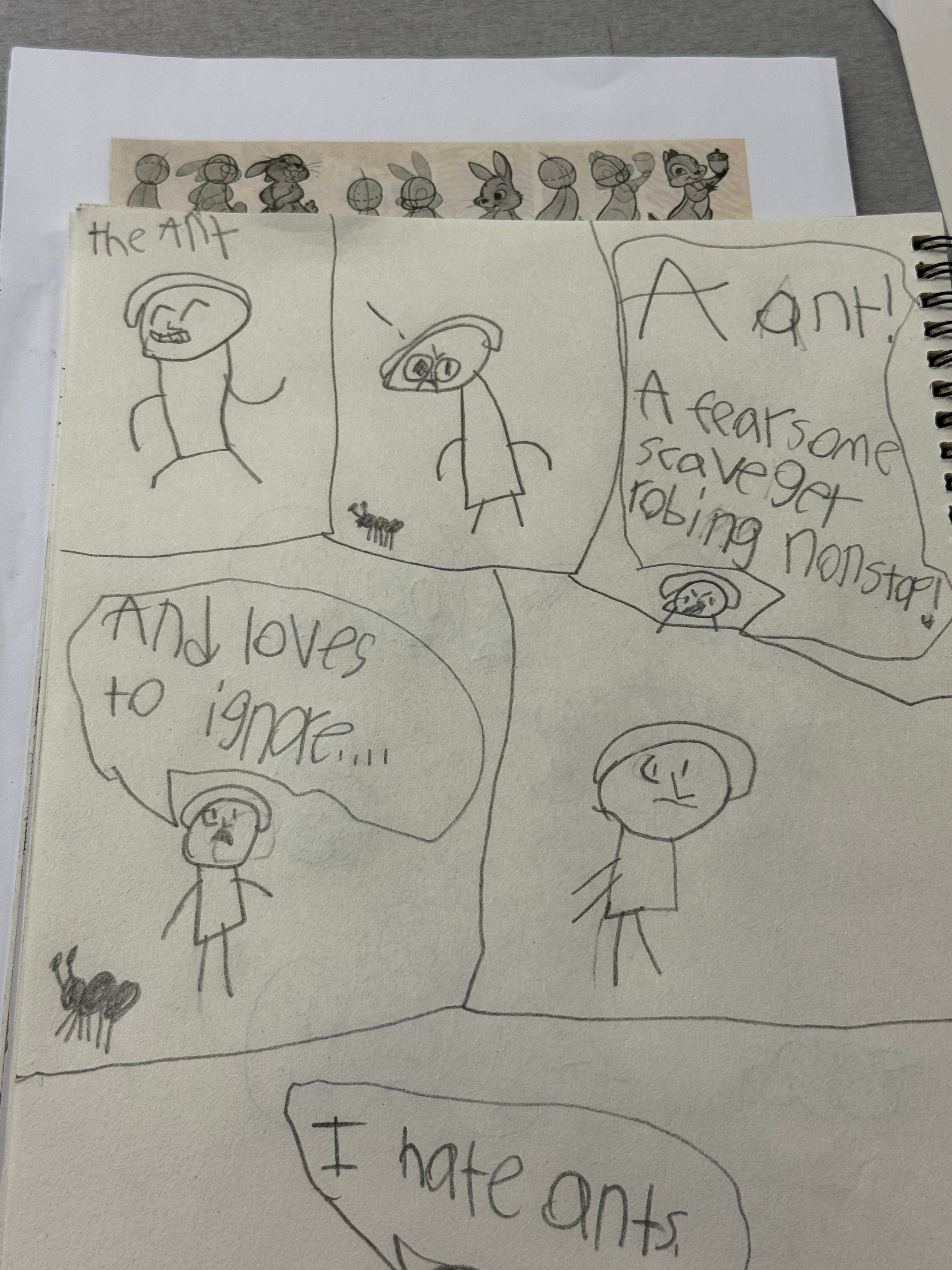 Finally, I wanted to share this comic that was created by a third grade student in my summer workshop. Look at his amazing grasp of pacing at such an early age! That fourth panel is doing a lot of work giving a brief pause for the joke to land. This kid will have a great career in comics!