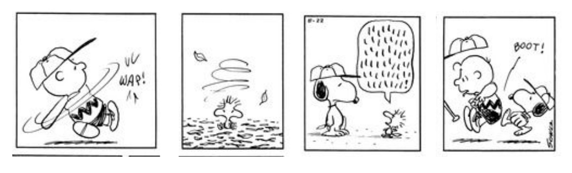What’s missing when I shortened it? Part of the setup—we aren’t quite sure where Woodstock is, and thus we don’t know exactly what happened in between the first and second panel. We don’t know that Snoopy and Woodstock have walk to a different place to do what they do. But overall, it still works.
