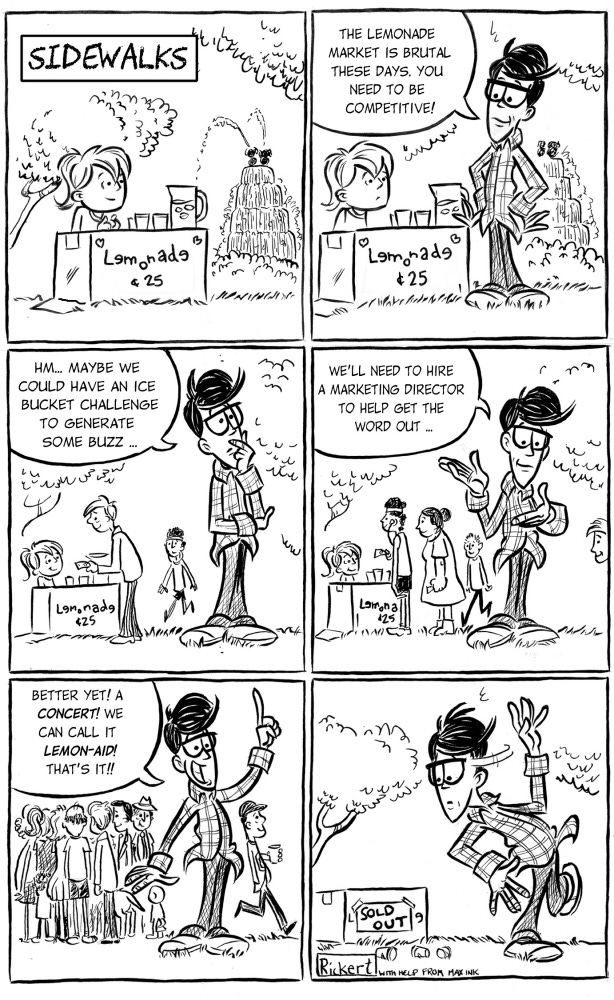 After I abandoned an idea involving food trucks that wasn’t really working, a friend gave me the idea of a lemonade stand. Much of this comic was the result of kicking around ideas at Stauf’s coffee shop with him.